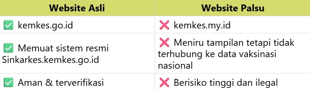 Tabel Perbedaan Website Kementerian Kesehatan Asli dan Palsu